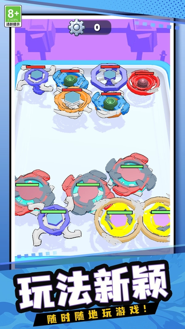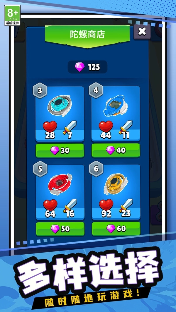 2、多样化的陀螺设计,解锁不同外观和性能的陀螺,每种都有独特属性。