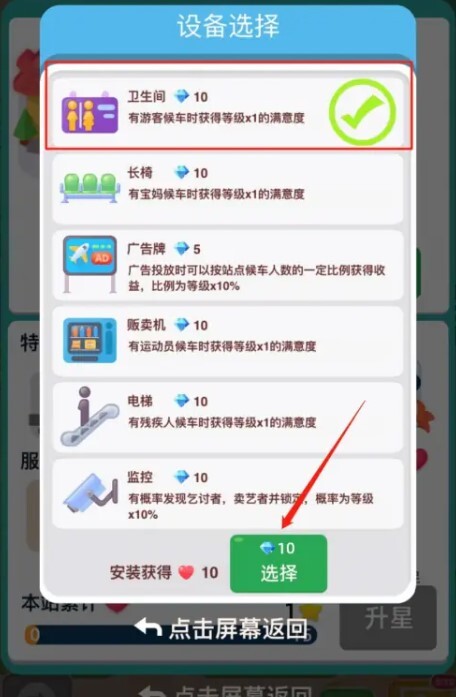 在“设备选择”页面里,选好你想添加的服务设施,接着点击页面下方的“选择”按钮。