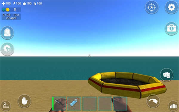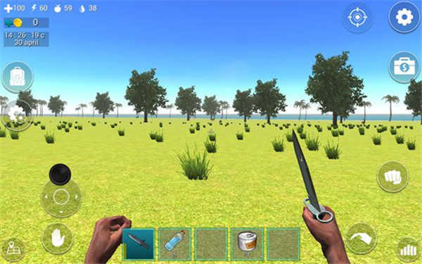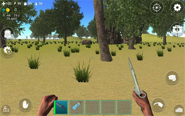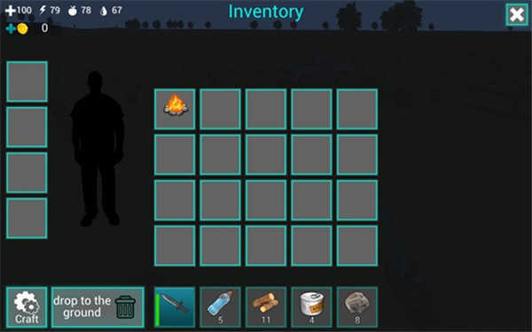 屏幕下方的道具栏里放着一把匕首和五瓶水,只要点击匕首就能把它握在手里。而屏幕左上角的四个带数字的图标,分别对应着血量、体力值、饥饿值和口渴值。