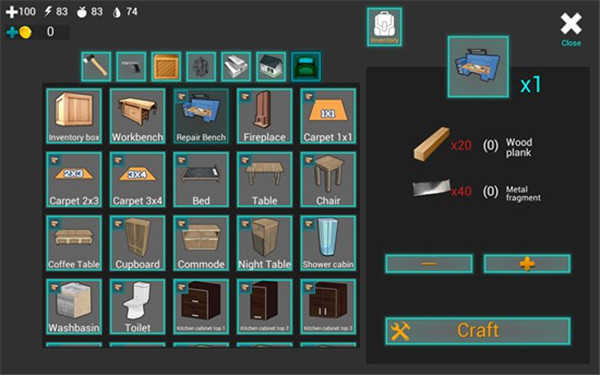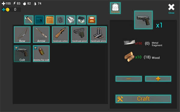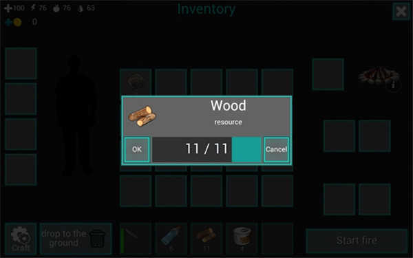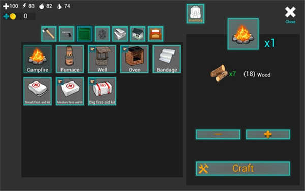 不过眼下我们首要的任务是生一堆火,生这个火堆需要用到7根木头。你先点击火堆的图标,接着再点击右下角的“Craft”按钮,这样就能把火堆制作出来了。