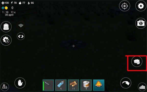 火堆搭建完成后不会自动燃烧,我们需要对准火堆,点击屏幕左下角的“手掌”按钮来点燃它。