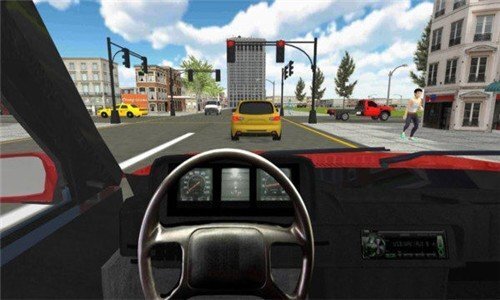 3、从白色轿车切换到红色座驾,在逼真的城市场景中开启冒险之旅,3D环境让人完全沉浸在驾驶氛围里。