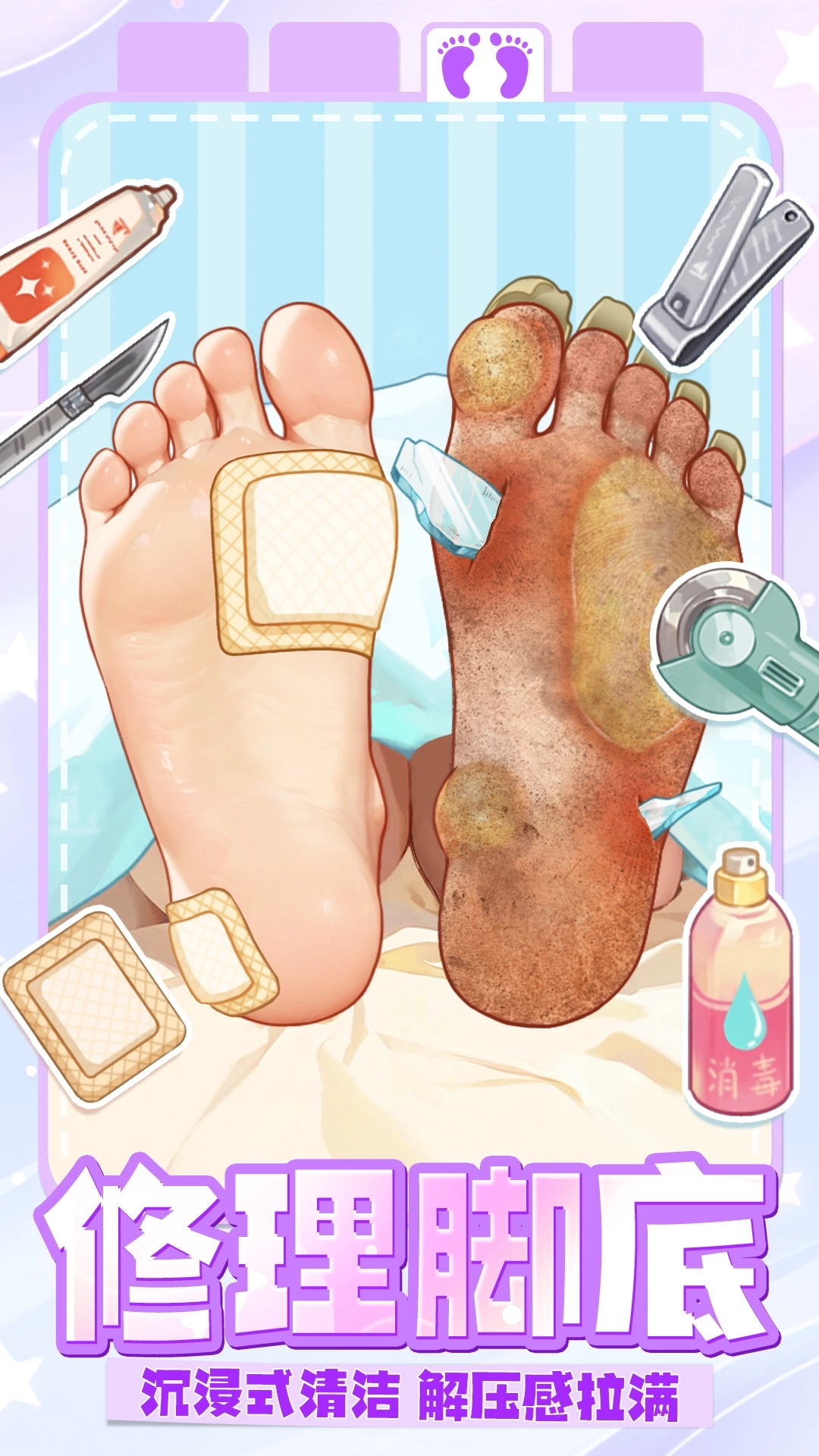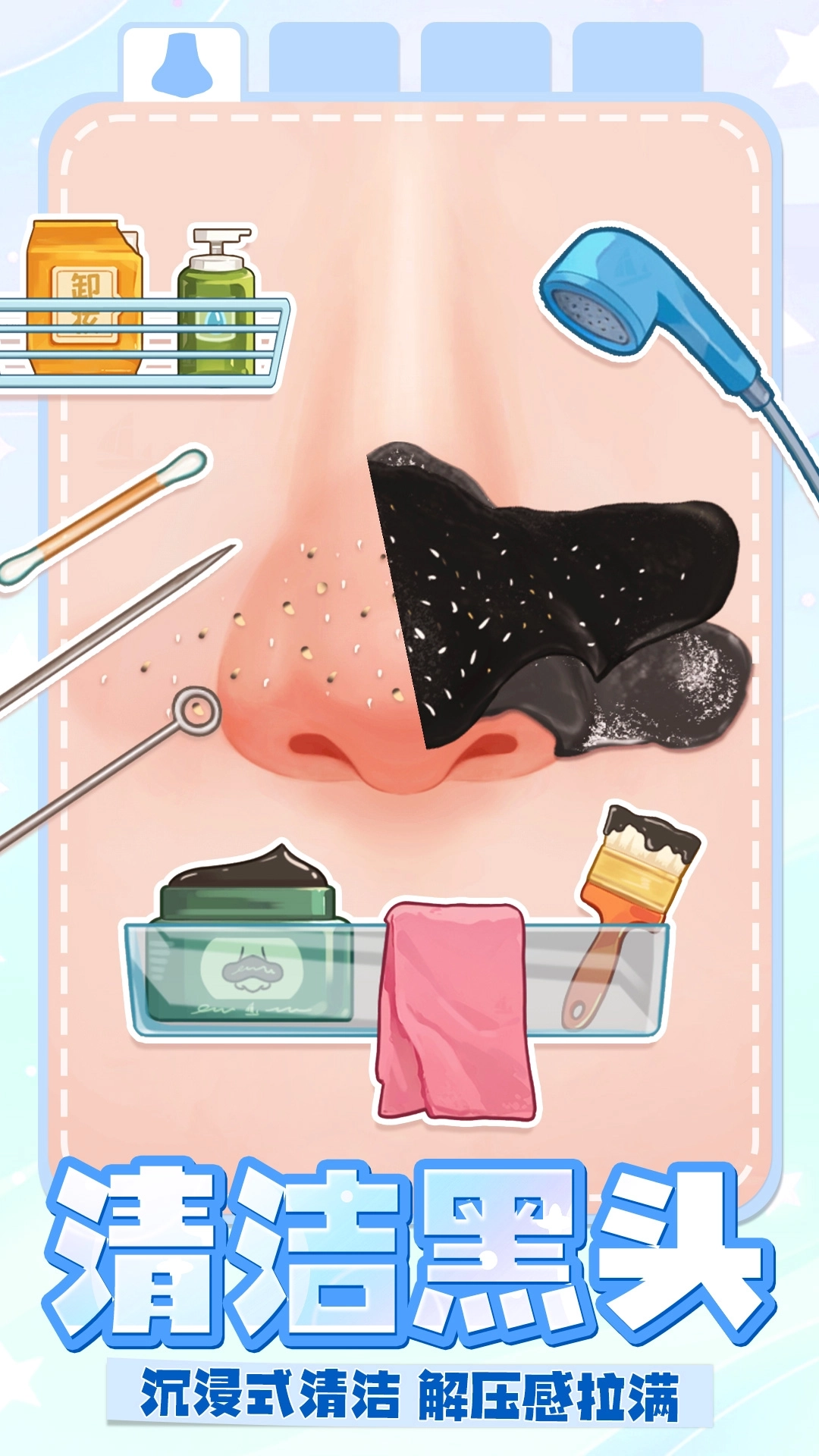 清理角色的鼻头,或者给顾客修脚,甚至还能给乌龟清理它的龟壳,这些任务都能在清理达人游戏中体验哦!每个关卡都有对应的工具可以使用,它们大体上是相同的,比如都会用到的镊子或者酒精,但是有些工具也不一样,例如棉签和面膜就是用在面部的!