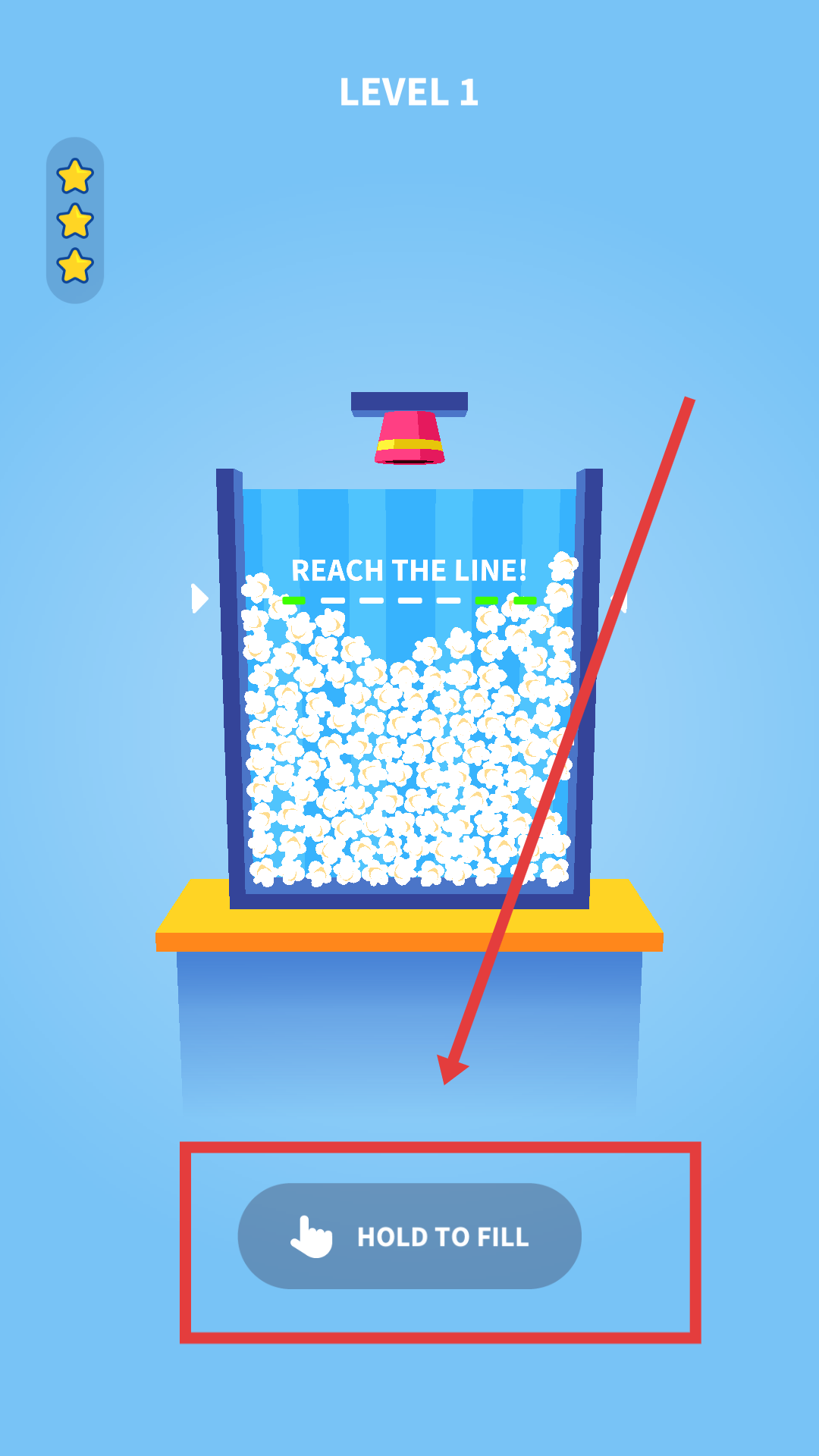 1、第一关需要找到填充按钮并按住,长按该按钮让机器填充爆米花,期间要密切关注爆米花高度是否接近标线目标线,在快要达到时及时松开按钮,避免爆米花溢出。