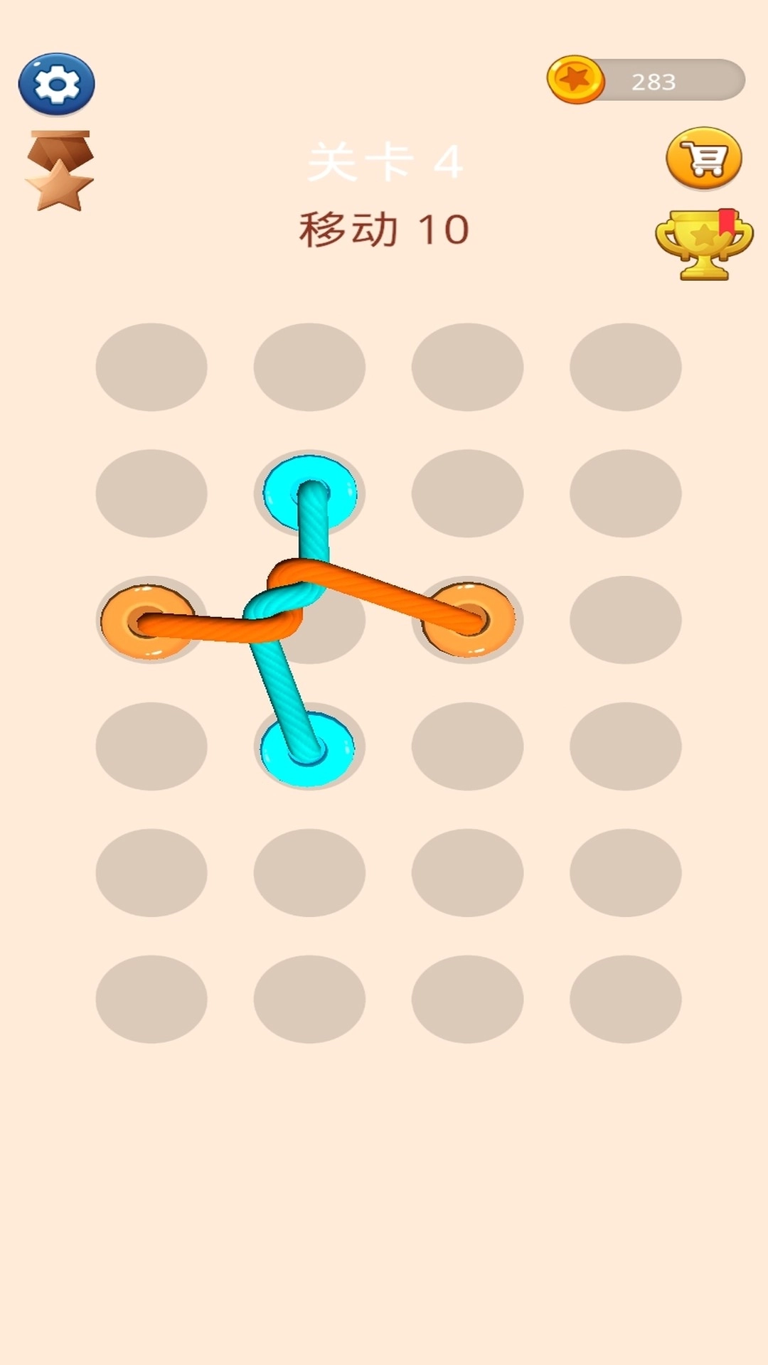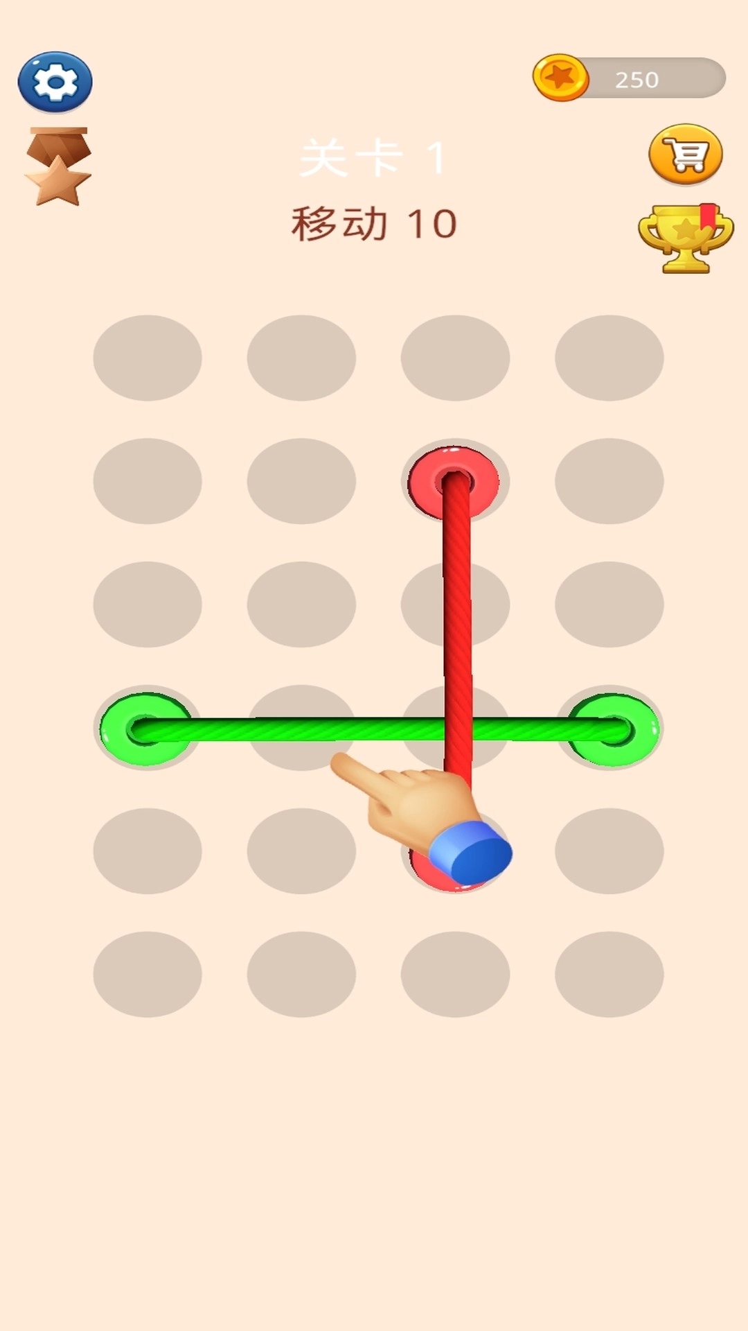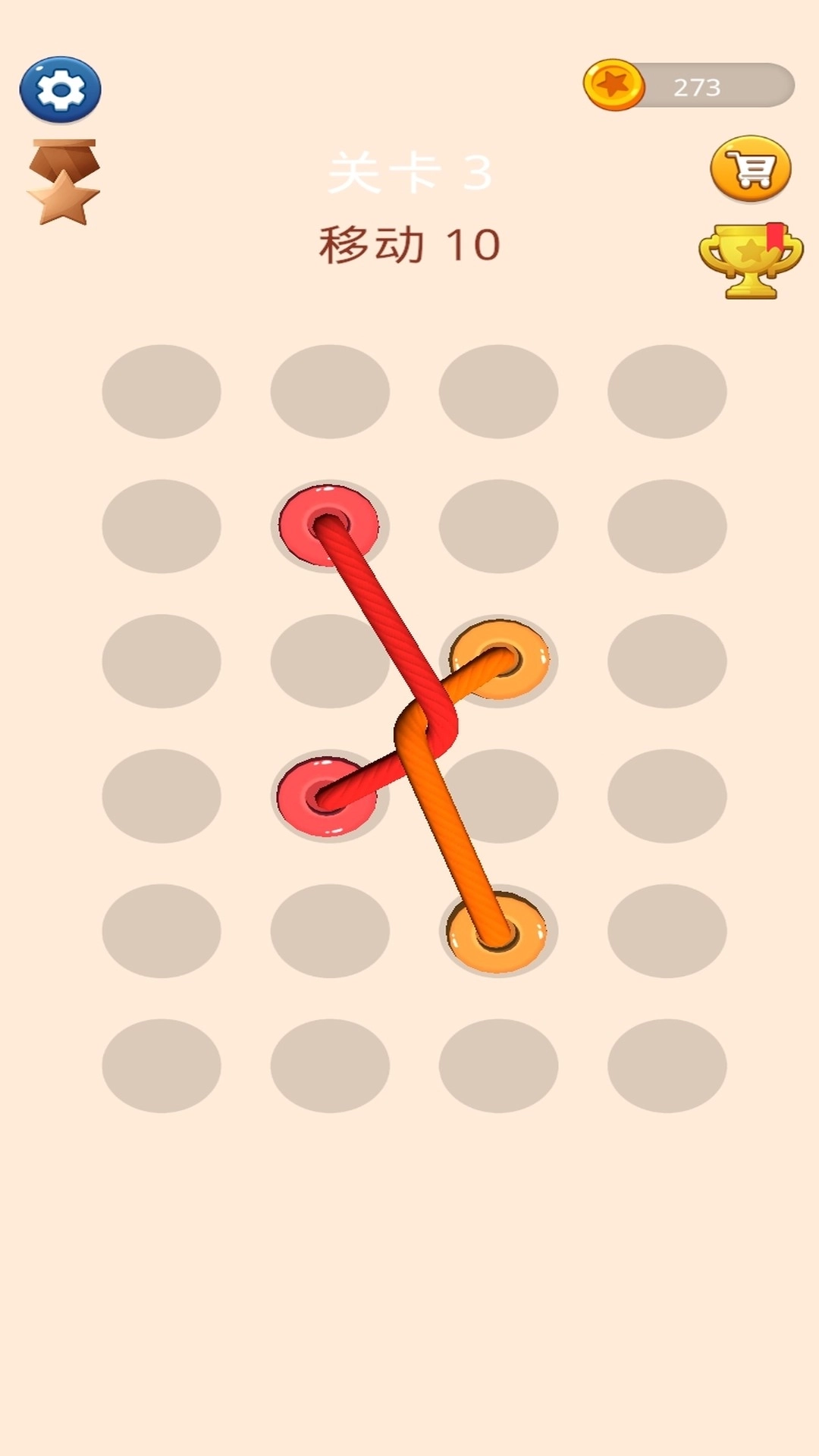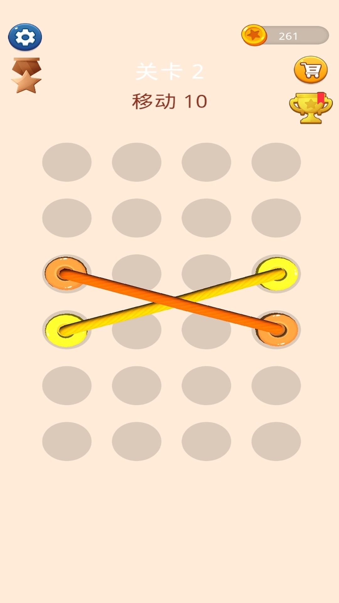 1、通过移动操作调整绳子位置,将所有交叉缠绕的绳子分离,无交叉即为通关成功。