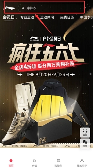 2、回到首页后,在顶部的搜索框中输入“冲锋衣”,以查找相关的商品信息。