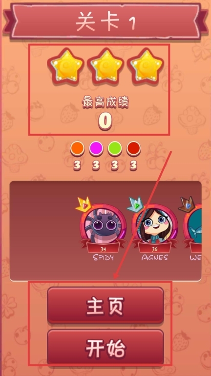 进入游戏后,首先点击开始按钮,即可查看关卡1的最高分数,完成三星目标能够获得更丰厚的奖励。
