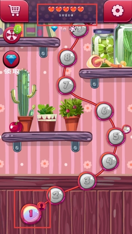 2、进入游戏主页后,点击带有数字“1”标识的按钮就能开启关卡1;页面上方的红心代表生命值,当生命值处于满值状态时,你就能更尽兴地游玩游戏。