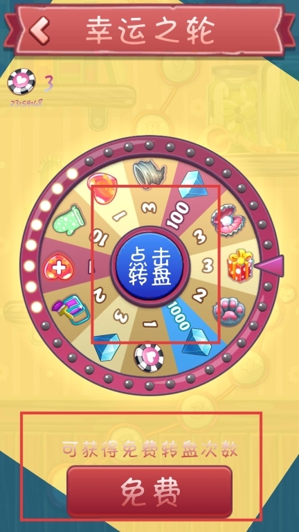 3、参与幸运转盘活动,点击转盘即可赢取奖励,也可以点击下方的免费按钮,领取免费的转盘次数进行抽奖。
