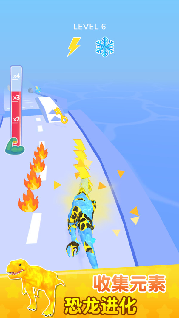 2. 沿途收集火焰元素能够提高力量等级,当积累到满值时会触发恐龙进化状态,而且不同元素的搭配还可以解锁特殊的属性技能。