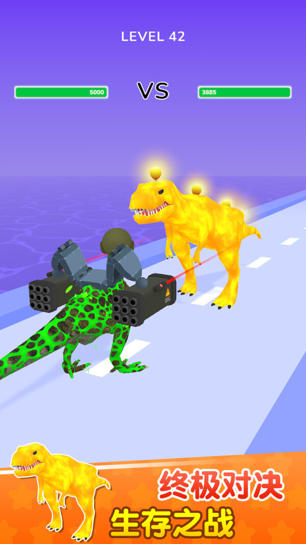 1. 点击攻击按钮后,待进化完成即可进入对战环节,恐龙将与敌人展开正面对决;点击速度越快,打击伤害就越高,也更容易取得胜利。