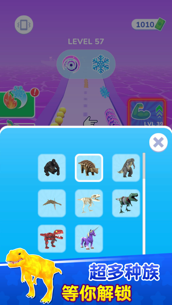 2. 扩充恐龙种类:解锁机制中涵盖了各式各样的恐龙造型,每一种都具备独特的技能或者冲刺速度,玩家能够通过收集这些恐龙来组建专属于自己的终极史前军团。
