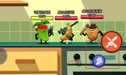 3、看看这三个水果角色的血量,点击红框里的奔跑图标,就能让角色上场战斗啦。