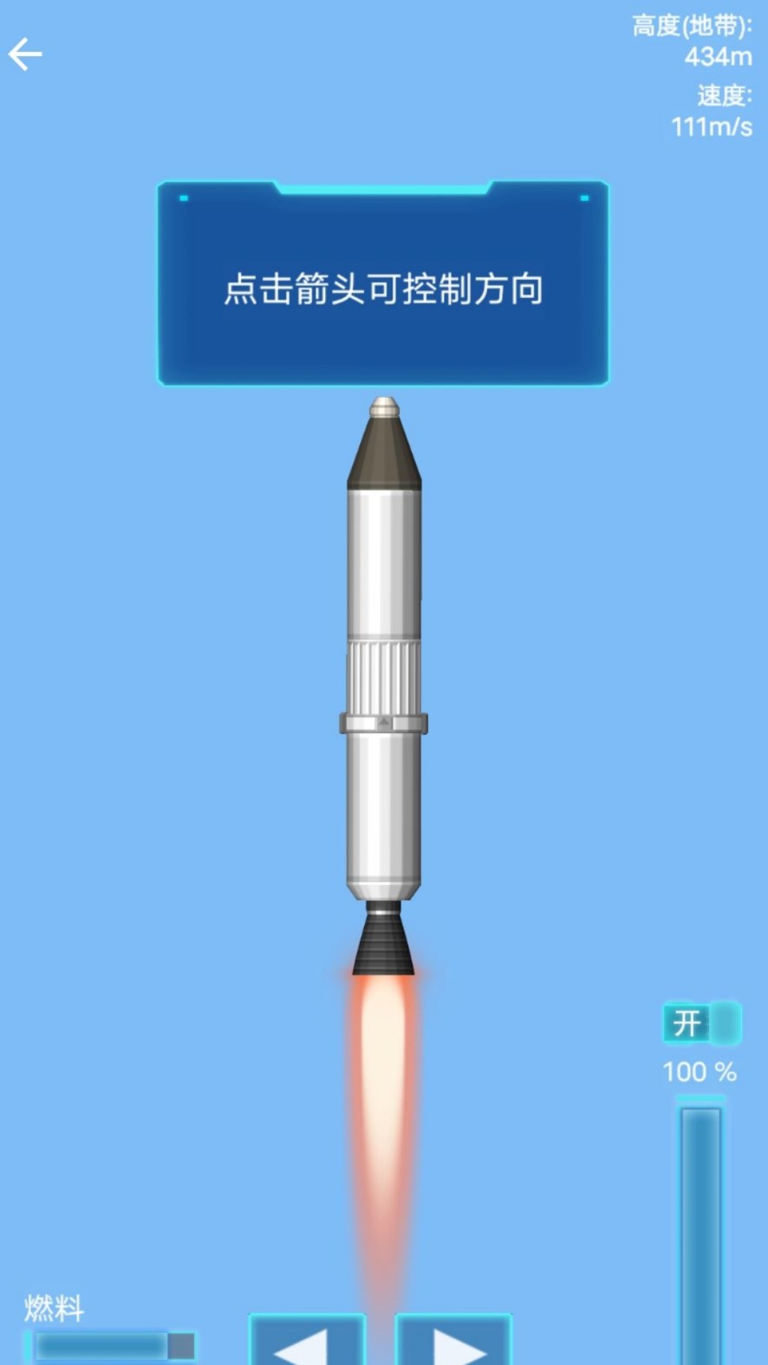 3、按顺序点按启动发动机与总开关按钮,就能顺利把火箭发射至空中。