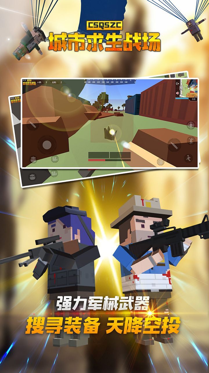 城市求生战场是一款卡通方块像素风格的趣味射击冒险游戏。玩家得在地图里保护好自己,全力成为最后幸存的人才能成功“吃鸡”。地图上散落的武器装备对玩家十分有用,拾取所需物品来武装自己,让自己具备战斗能力,去和其他玩家一决高下吧。