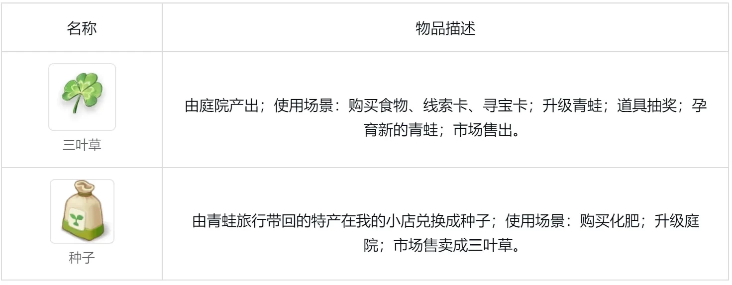 三叶草:通过在庭院里进行播种和施肥的操作后收获获得,它的用途包括:一是可以用来购买食物、线索卡以及寻宝卡;二是能够用于青蛙的升级;三是可参与道具抽奖活动;四是能为孕育新的青蛙提供支持。