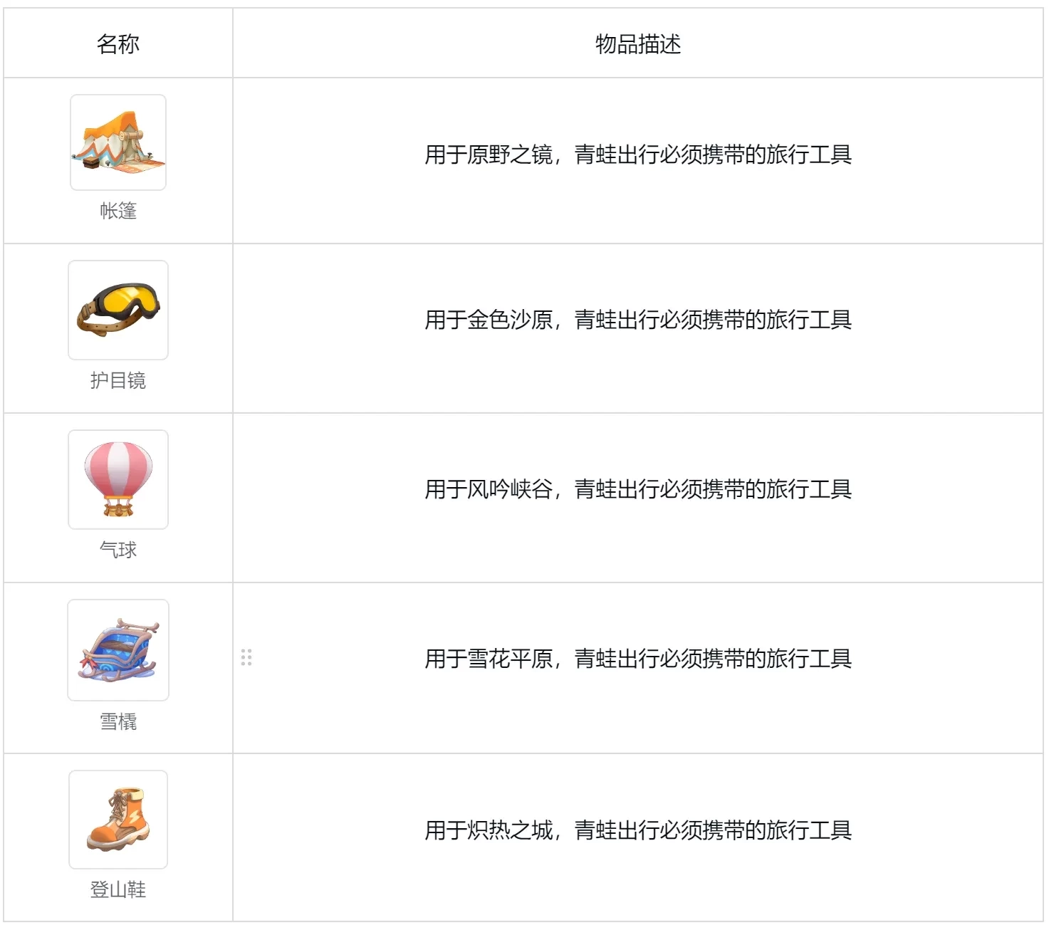 商店:可使用三叶草、种子、工具碎片兑换对应的道具(如寻宝卡、线索卡)、物品(如化肥)、食品(如三明治、华夫饼、蛋黄酥)以及旅行工具(如帐篷、护目镜、气球、雪橇)等。