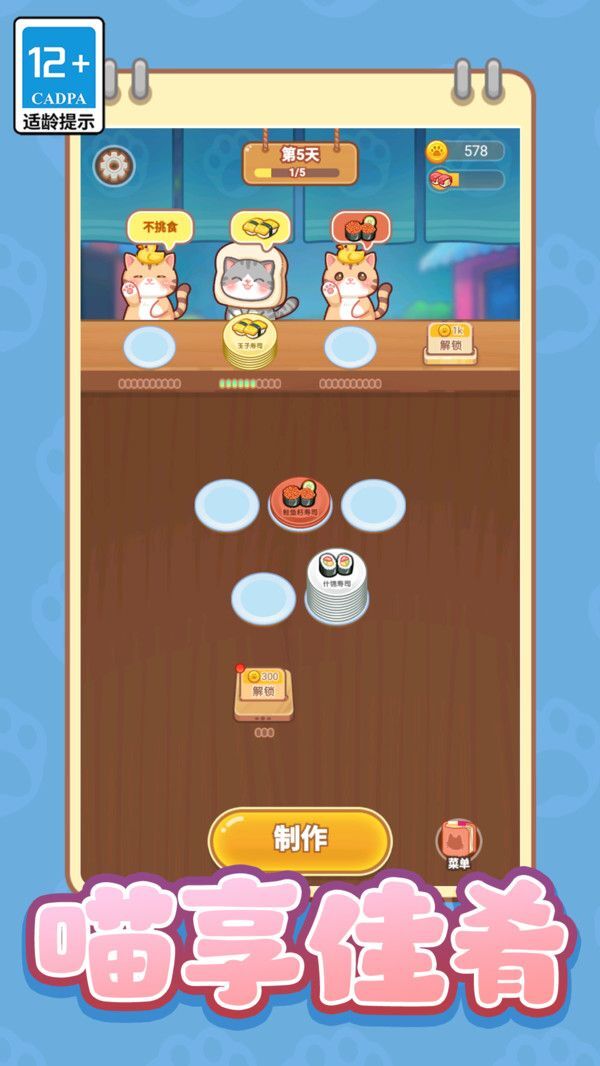 2、通过积累游戏内的货币,一步步解锁菜单里还没开放的寿司种类,拓宽能够投喂的食物选择,以此来满足更多小猫的需求。