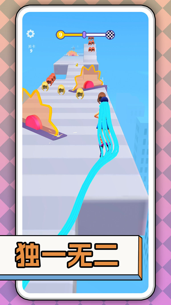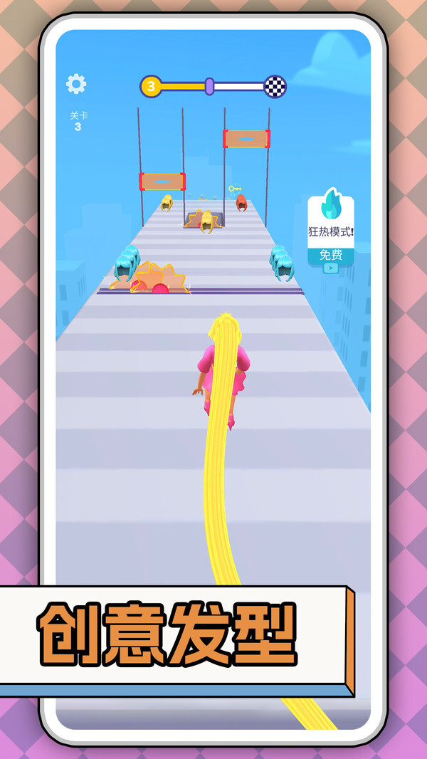 1、采用经典的跑酷玩法,玩家需要收集头发,同时避开齿轮、剪刀等各类障碍;