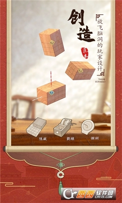 1、游戏在操作上比较简单,玩家在玩这款游戏时需要充分发挥你的想象力,玩家只需要进行简单的点击和消除等操作,就能够打磨和创建出准确的榫卯结构,
