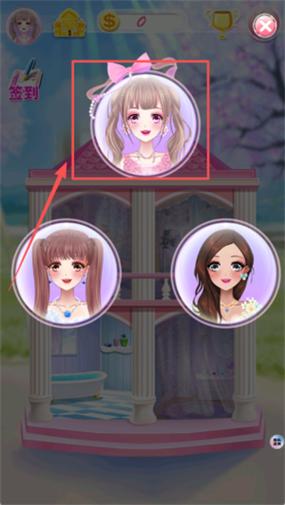 1、在身着粉色裙子的女孩画面里,找到她胸前那个粉色圆形的播放按钮,点击该按钮就能开启装扮之旅啦。