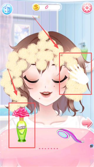 4、给闭眼女孩洗头时,先拿起左下角那瓶绿色的洗发水,接着点击头发上有黄色泡沫的地方来完成清洁。
