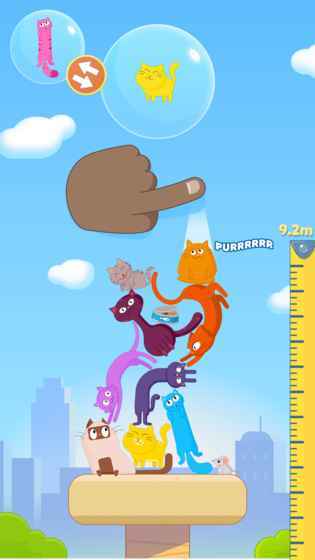 调整姿势、选好位置,把猫咪放上去,尽量搭起最高的猫咪塔,争取拿到高分!要是猫咪从塔上掉下来,你和猫咪的游戏就结束啦;