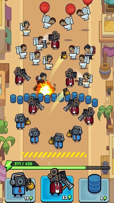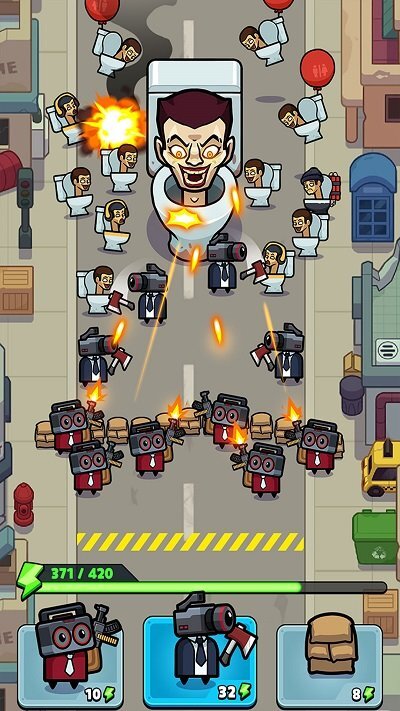 给大家带来《疯狂马桶人》手机版游戏!这款割草射击游戏超有意思——满屏都是马桶人,你得指挥士兵把它们全消灭掉。还能搭配不同阵列展开射击,战斗体验燃到爆,快来试试吧!
