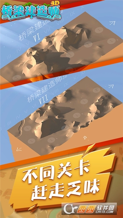 桥梁建造师3D游戏是一款休闲建造桥梁的闯关游戏,游戏画质效果好,采用的3D视觉效果,游戏里面的关卡多,不同关卡里面,玩家需要根据水流以及桥梁布局进行观察,需要准确无误的将桥梁连接起来才能够通关,感兴趣的伙伴,西西即可玩哦!