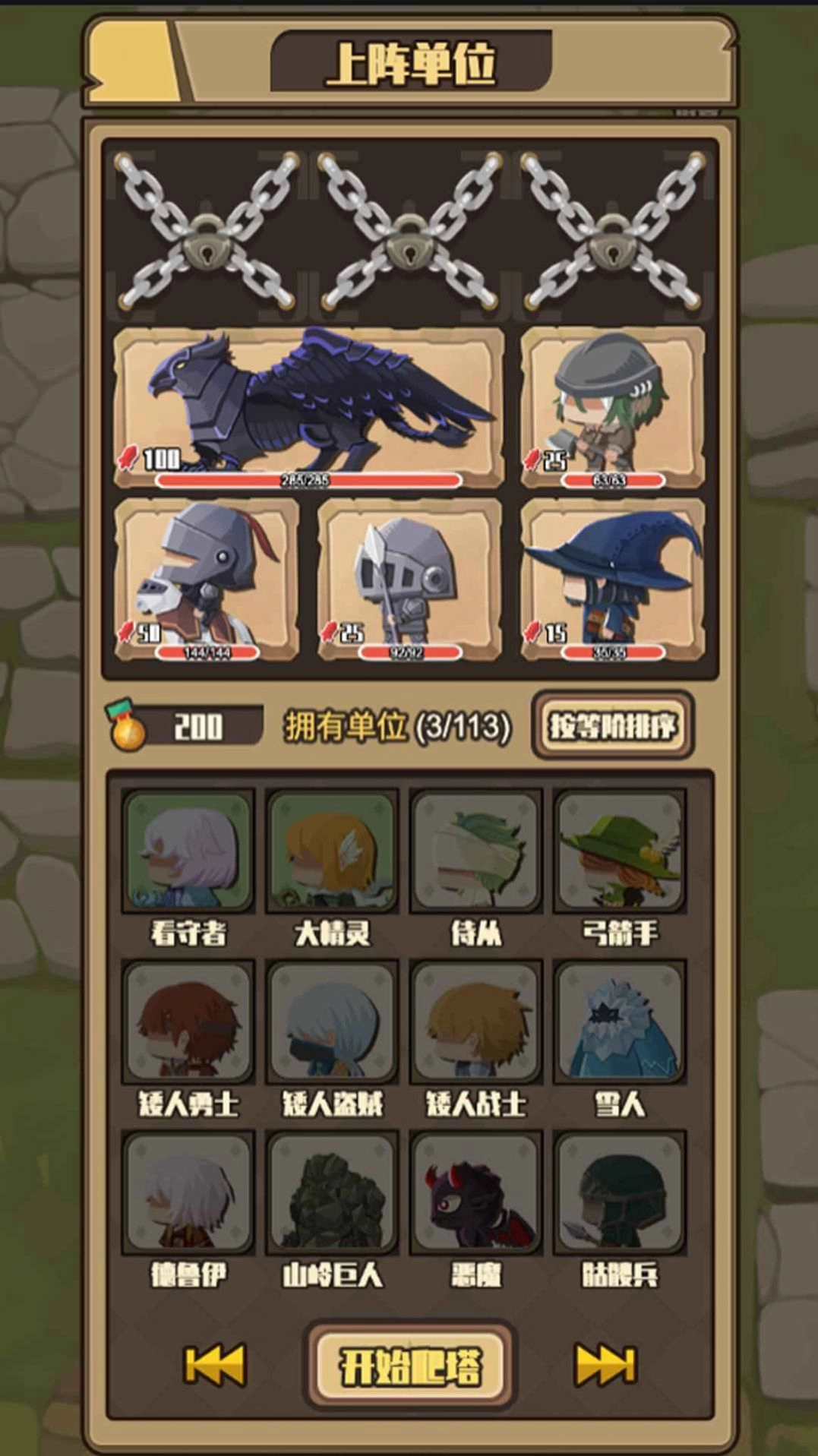 1、派遣你的部队去闯荡关卡,每个爬塔关卡都有不同的敌人。