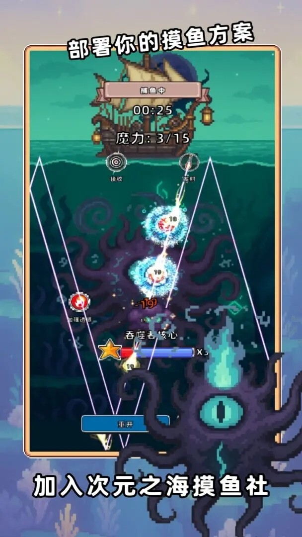 《摸鱼神力社》是一款全新的轻沙盒游戏,你将在奇幻的次元之海中航行,穿梭于人间、天堂、地狱乃至克苏鲁式的诡谲维度,捕捉形态各异的鱼灵。这片神秘海域里散落着无数充满未知的海洋奇境,正等待你的探索与发现。游戏采用像素风格打造,规则简单易上手,每个战斗场景都十分精彩刺激!