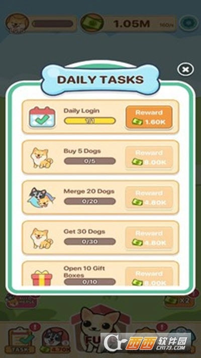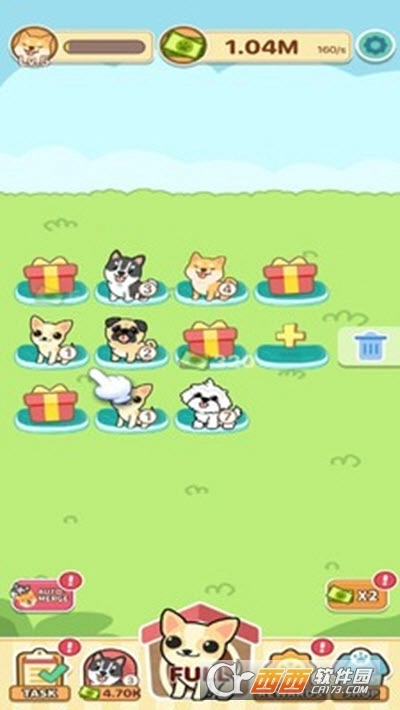 小狗合并萌趣可爱的合成小游戏,轻松放置,简单点击,不断的获得更多品种的狗狗,并让他们不断的产生更多的收益,全新的狗狗合成进化为把你带到全新的狗狗星球哦!小狗合并一起体验吧!