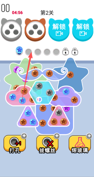 3、关卡难度呈梯度上升,从起初的几颗螺丝逐步增加到满屏的螺丝数量,玩家的手速也会随着难度的提升而加快。