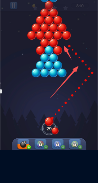 1、滑动屏幕来调整发射角度,点击确认后把气泡射向指定方向,以此完成消除操作。