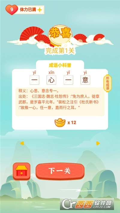 成语填词:四字成语填空式闯关,在休闲时光轻轻松松学习成语知识和它们背后的小故事哦。