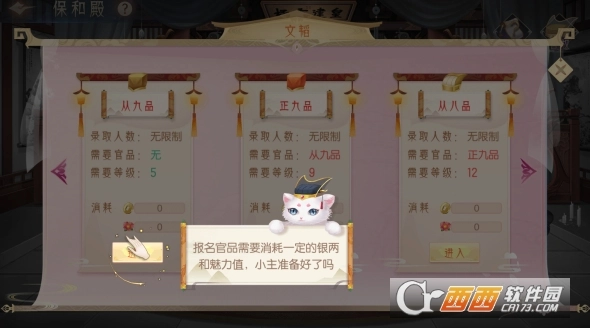 小主等级达到5级,即可开启朝堂功能,在宫中出入,没有一官半职可是不行的,升官需要消耗银两和魅力值,升官后每日都可领取相应官品的俸禄。
