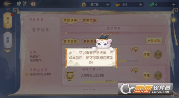 小主等级达到16级,即可开启成就系统,达成成就后即可获得成就奖励,其中包含各种霸气的称号,还能增加属性噢。