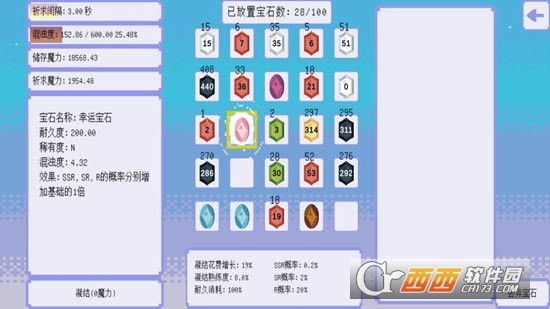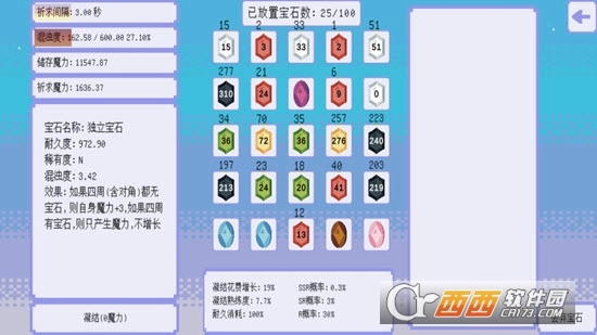 100个宝石是一款策略益智休闲游戏。放置100个宝石就是你的任务!每个宝石都有不同的功能和不同的稀有度。将宝石放在矩阵上就可获得魔力。获得魔力之后,可将魔力凝结变成更多的宝石。当然,伴随而来的还有宝石的混浊,它将腐蚀你的心智,使宝石被破坏。你能否完成100个宝石的任务?