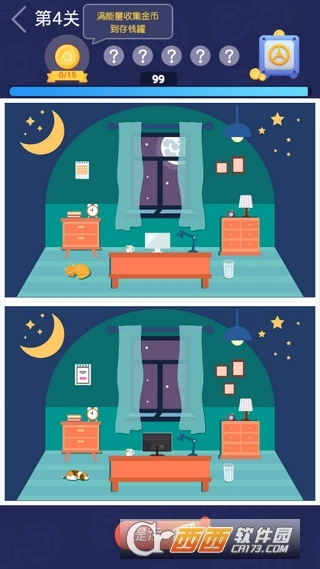 1、每一张图片里面都会有三处地方不同,你只需要找出来就可以进入下一关了。
