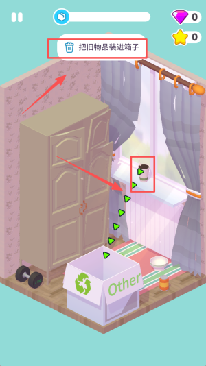 2、达成目标任务,例如将旧物品放入箱子,通过点击拖动操作就能完成。