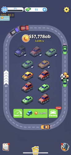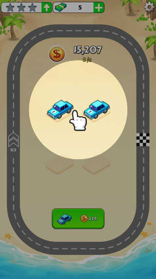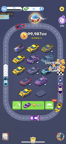首先游戏里的停车位数量是有限制的,玩家能把等级相同的赛车两两合成,而等级更高的汽车可以放到赛道上,以此来获取金币资源奖励(这个过程是完全自动化的)。