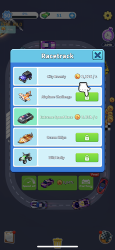 2、放置系统。你的载具会在赛道上自动行驶,即便你处于离线状态,也依然能够获取收益。
