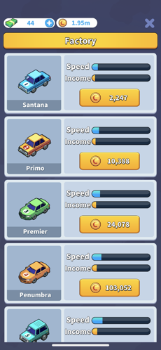 汽车的等级越高,造型就越酷炫,产生的金币也会更多,这些金币需要持续合成。