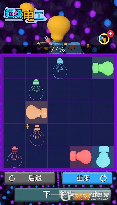 超级电工是一款好玩的休闲连接游戏,把不同颜色的灯泡连接即可点亮,但千万注意不要把电线缠绕或交叉,不仅看手巧,还要考验你的策略哦;一次通过无失误可以获得星星,还有机会获得指引灯泡,失误了可以重新再来哦;多个级别、不同难度、不断挑战,加油!