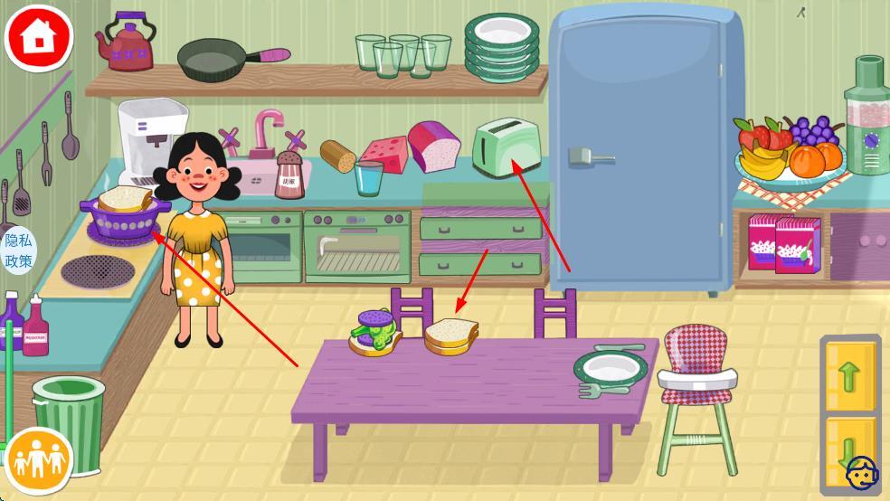2、在厨房区域和角色进行互动,搜寻所需物品,操作烤面包机之类的厨具,完成烹饪相关的任务以推动流程进展。