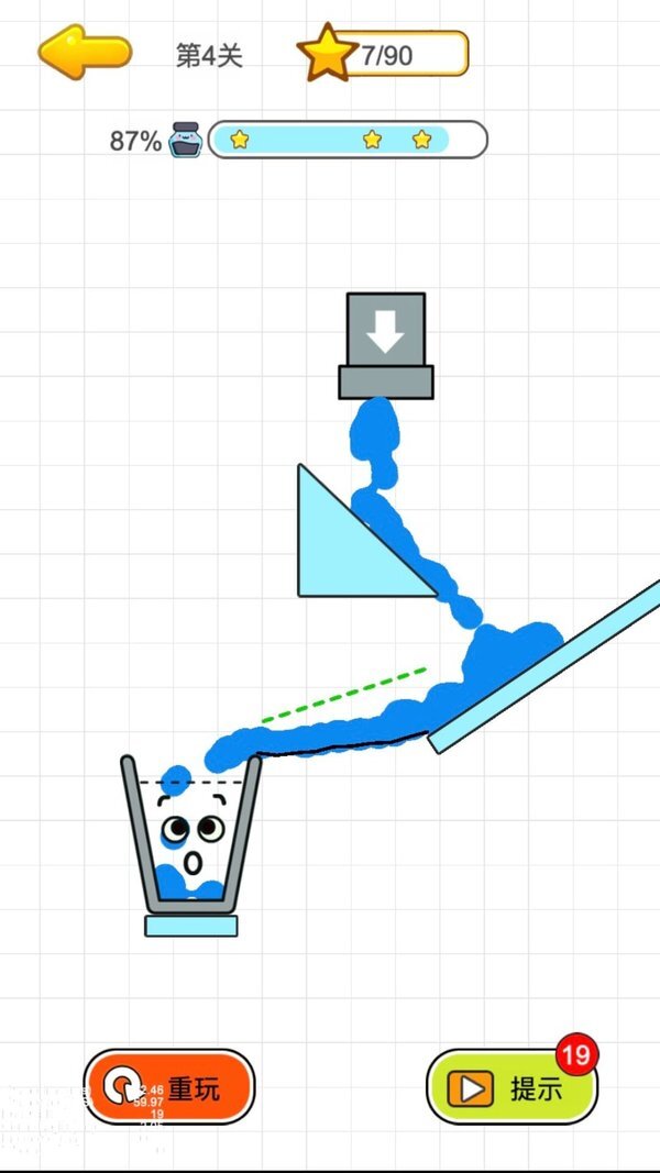 1、要在屏幕上绘制恰当的线条,引导水流流入指定的杯子。