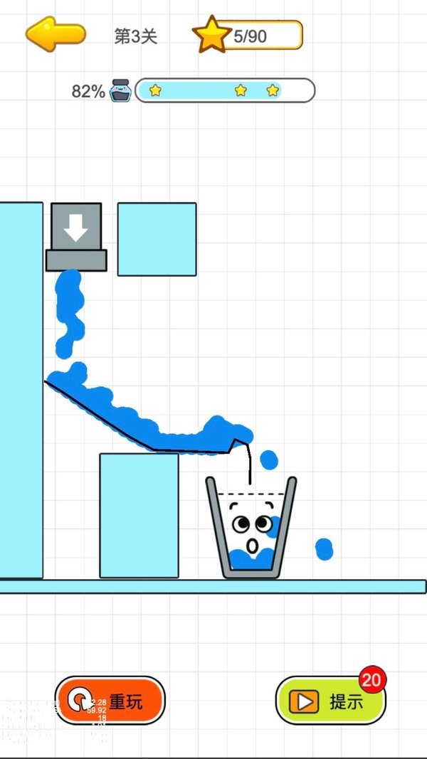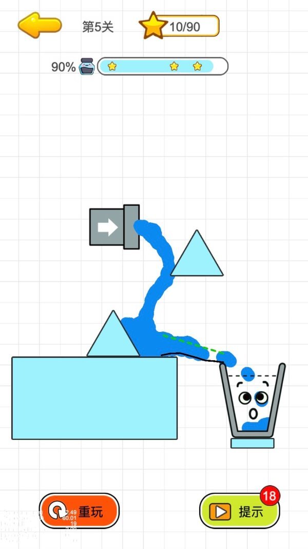 1、玩家用手指在屏幕上画出线条,引导水流绕开障碍,使其顺利流进目标杯子。