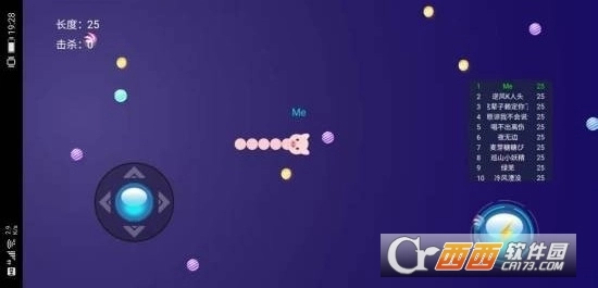1、控制摇杆移动你的小蛇。如果吃了地图上的彩色小球,小蛇就会变长。