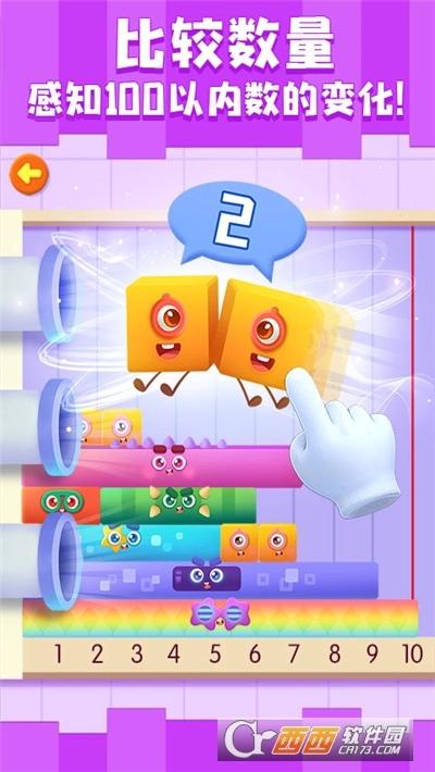 在难度更高“沙盒”模块里,小朋友可以组合出不同长度的数字宝宝,感知100以内的数量变化。还能将数字宝宝摆在一起,进行大小比较。