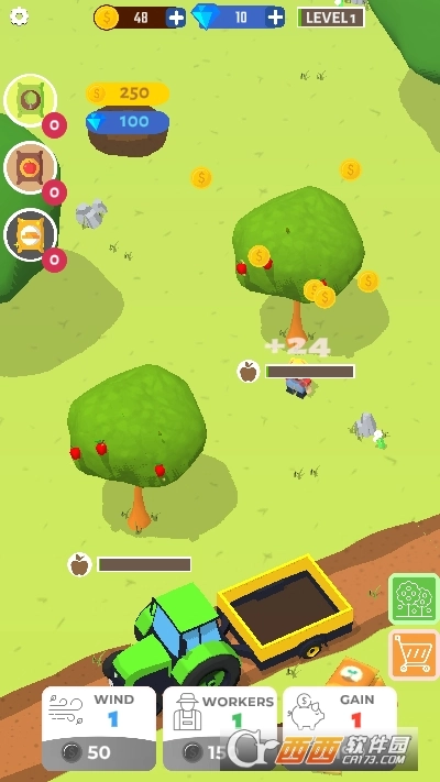 这是一款休闲益智类的模拟经营游戏,在游戏中玩家需要展开模拟经营,不断的种植果树的品种,种植并收集尽可能多的水果! 用各种肥料和道具帮助树成长!